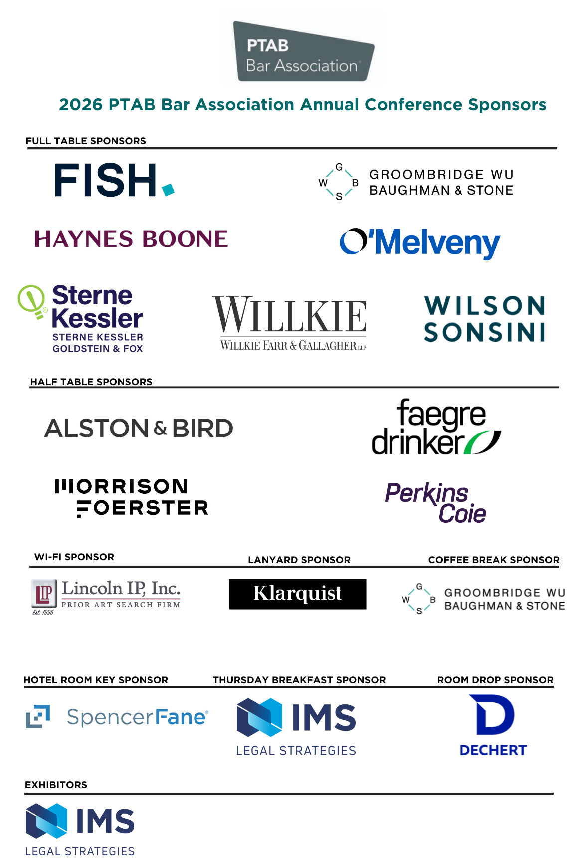 Sponsorship opportunities are OPEN. Take advantage of Early Bird rates until January 14, 2026. Please visit 2026 Annual Conference Sponsorship and contact LaTrese Wallace at latrese.wallace-ptab@mci-group.com to partner with the PTAB Bar Association as a valuable sponsor for this event.
